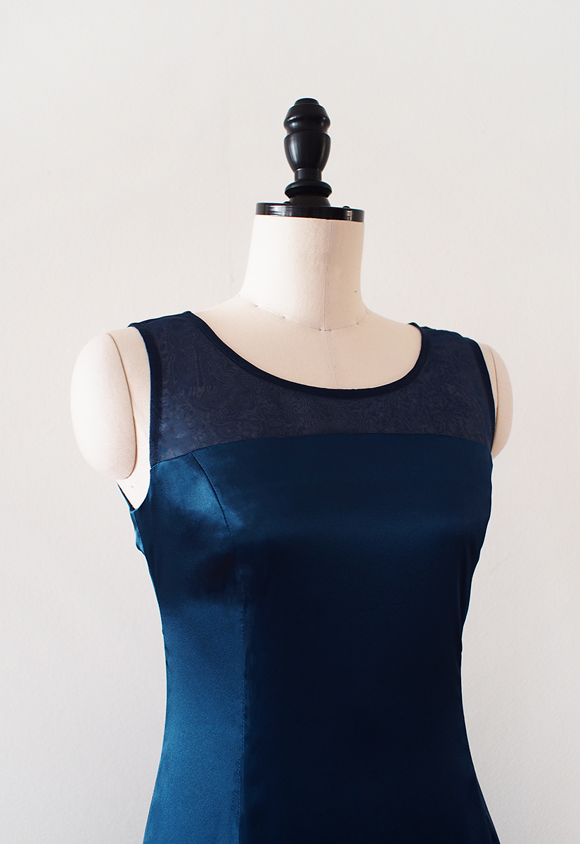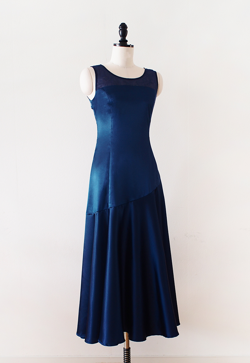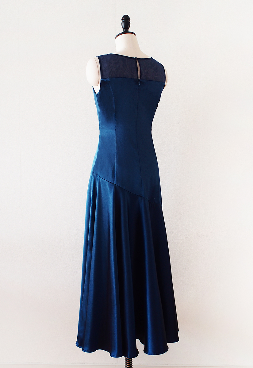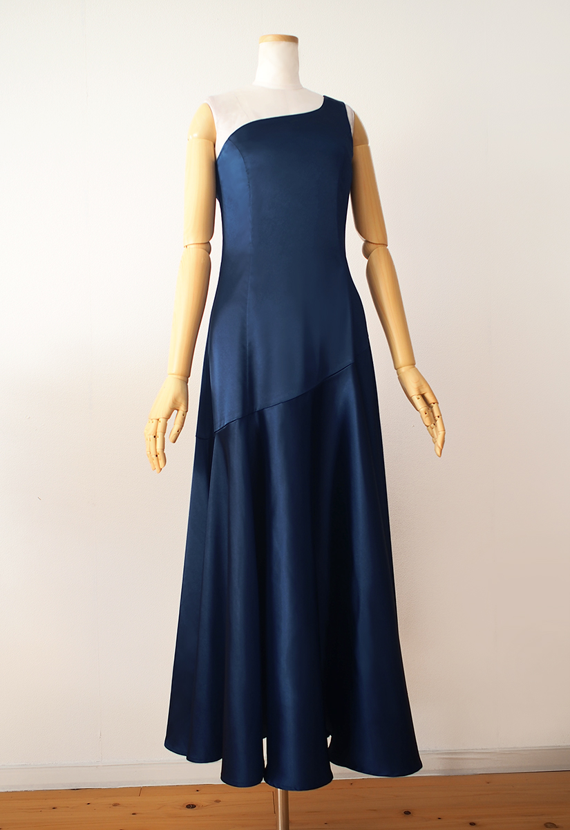 当店のフラドレス53をストレッチサテンのディープブルーでお作りしました。胸上をオーガンジー切替にカスタマイズ。そのため、程よく抜け感が出てグッと印象的なものに。深いブルーとのバランスも素敵ですね。斜めの切替から広がるスカートは、たっぷりフレアがエレガント。上品な中に軽やかさを感じる作品です。