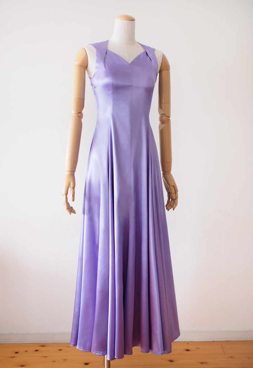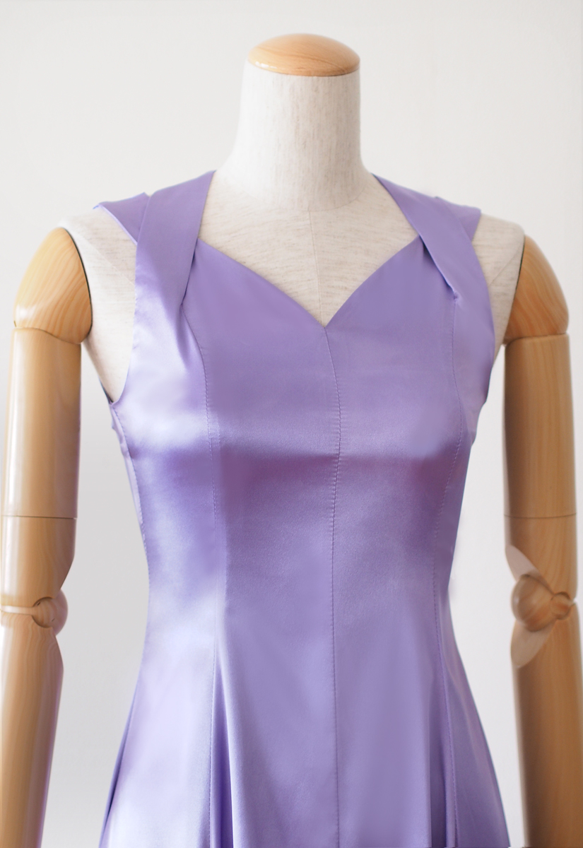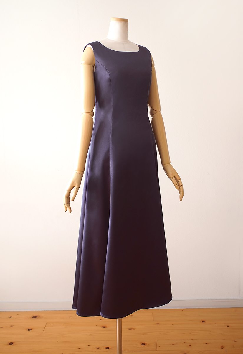 当店のフラドレス30を、ストレッチサテンのグレープグレーでお作りしました。袖なしですっきりとしたラインのシンプルなフラドレス。落ち着きのある深い紫色と、光沢のあるサテンの生地が気品を漂わせます。