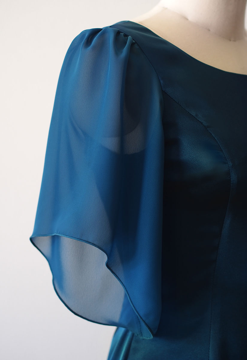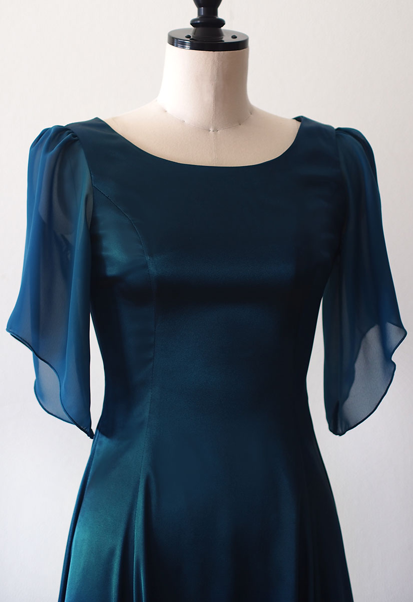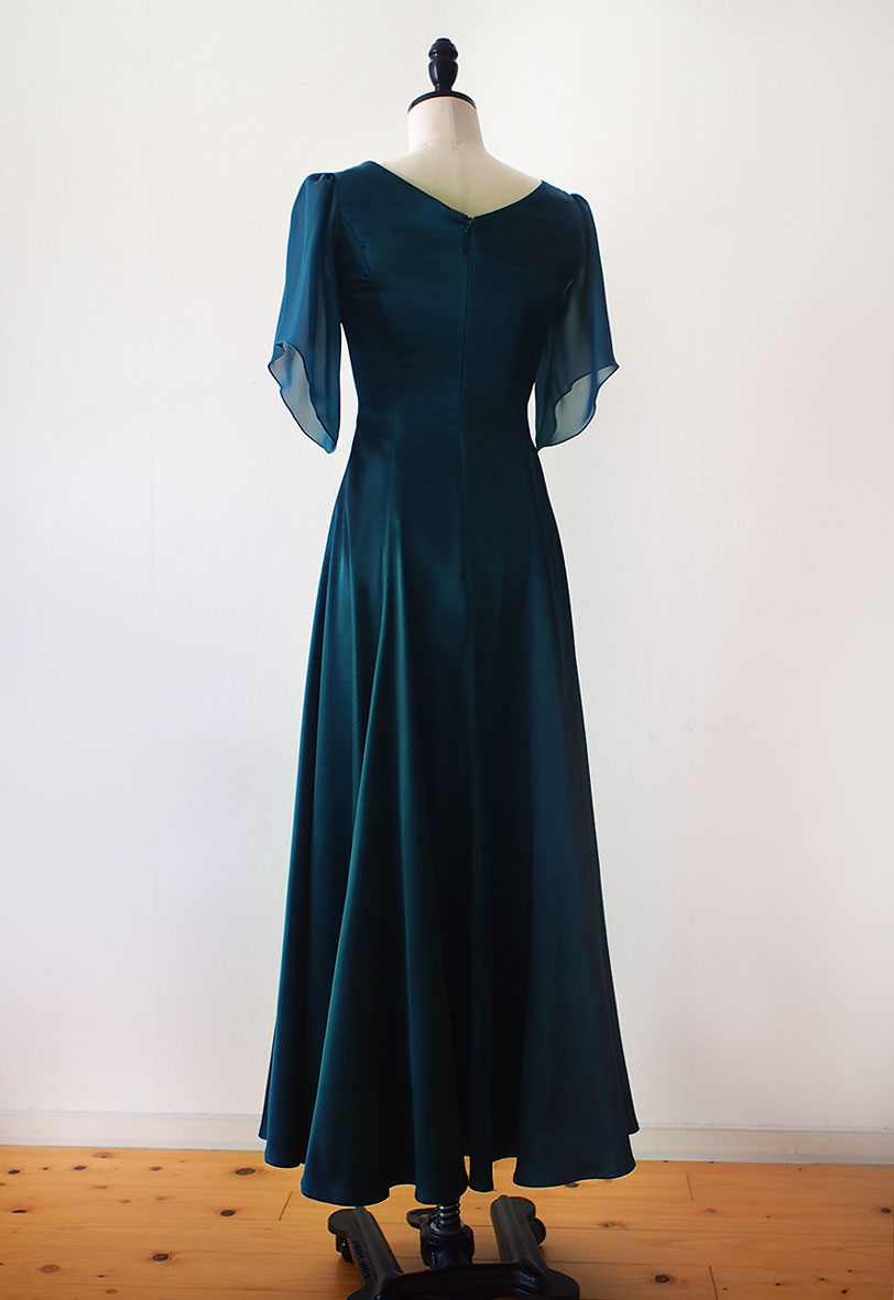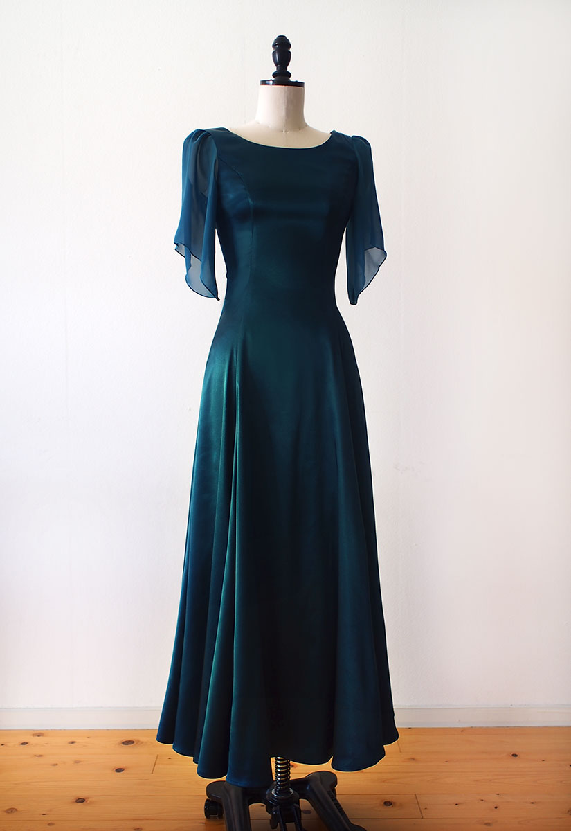 当店のフラドレス30の8ヤードタイプにシフォン袖を付け、ストレッチサテンのティールグリーンでお作りしました。 落ち着いた大人らしさを感じる深いグリーン。8ヤードのたっぷりめな裾周りが美しく 揺れるフレアーを作り出します。オーダーメイドでお作りしたシフォンのお袖も、軽やかでエレガントな印象を演出しています。
