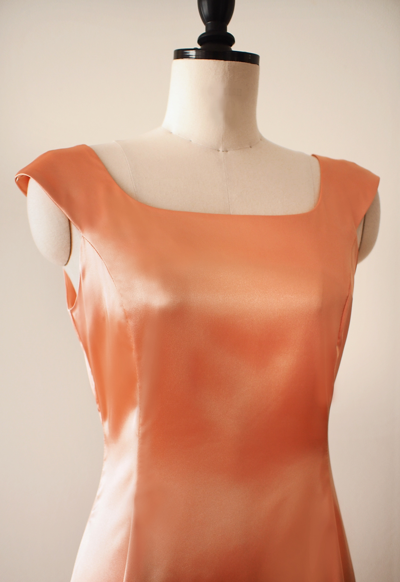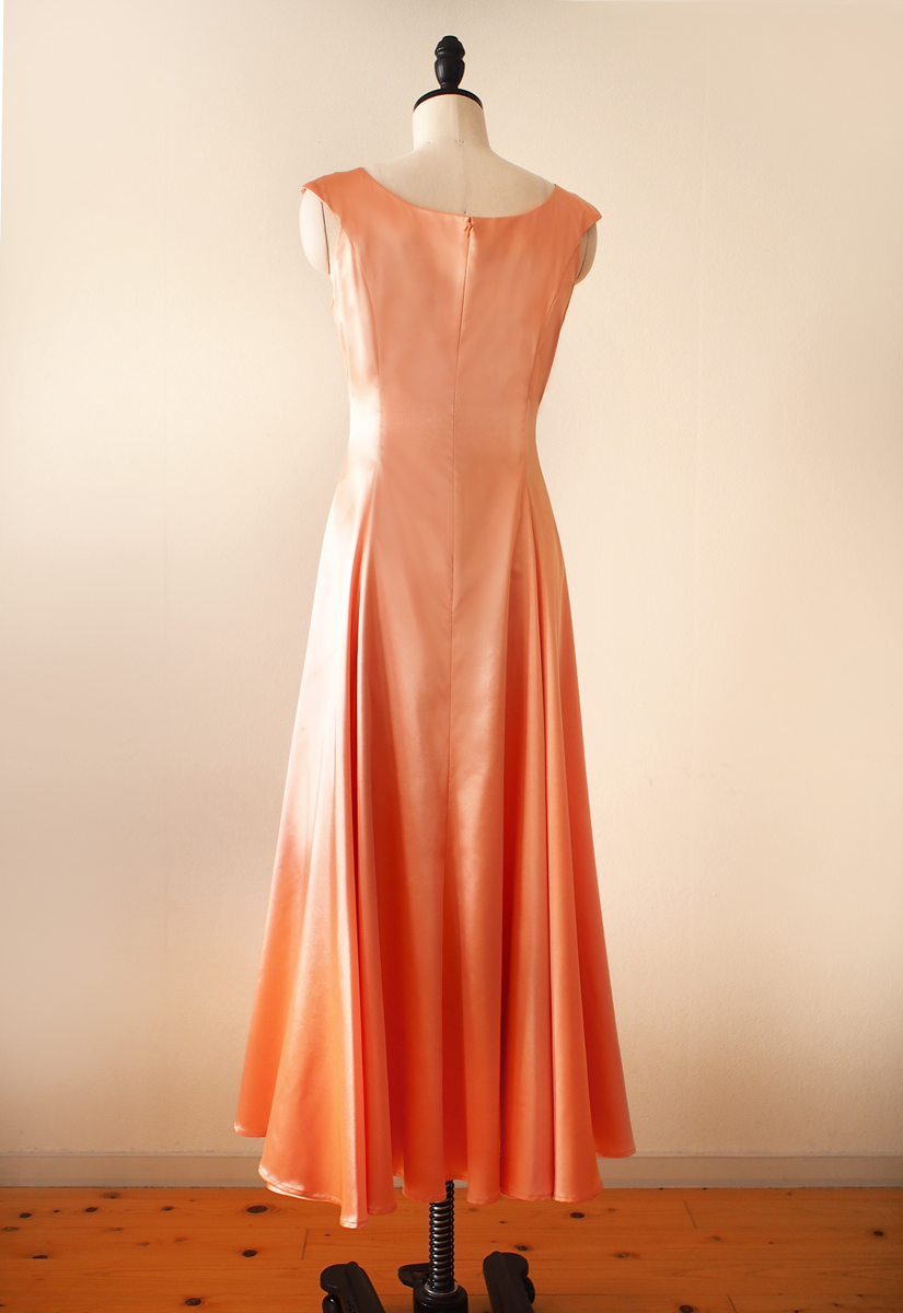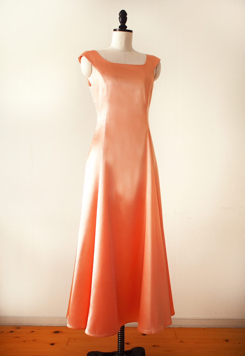 当店のフラドレス44 8y を、ストレッチサテンのアプリコットでお作りしました。 光沢が美しいサテンのドレス。アプリコットという優しい色でお作りすることで、あまやかな印象に。 踊る際には柔らかいフレアーがゆったりと優雅に揺れ、上品さと華々しさ を演出致します。