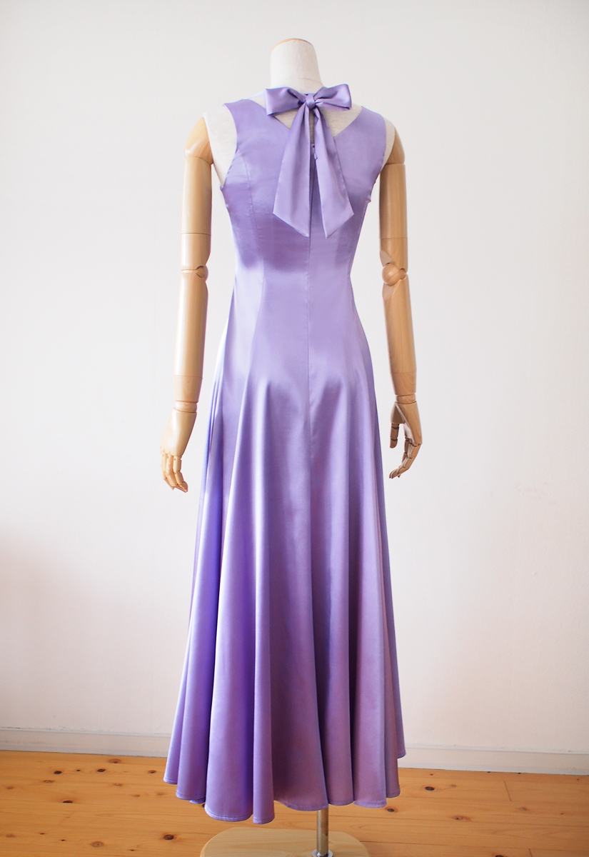 当店のフラドレス54をご注文いただき、 ストレッチサテンのラベンダーでお作りしました。 優しく輝くラベンダー色が淑やかな美しさを演出。後ろを向けば可愛いリボンがお目見え。エレガントな中にキュートを覗かせる、魅力溢れるフラドレスに仕上がりました。